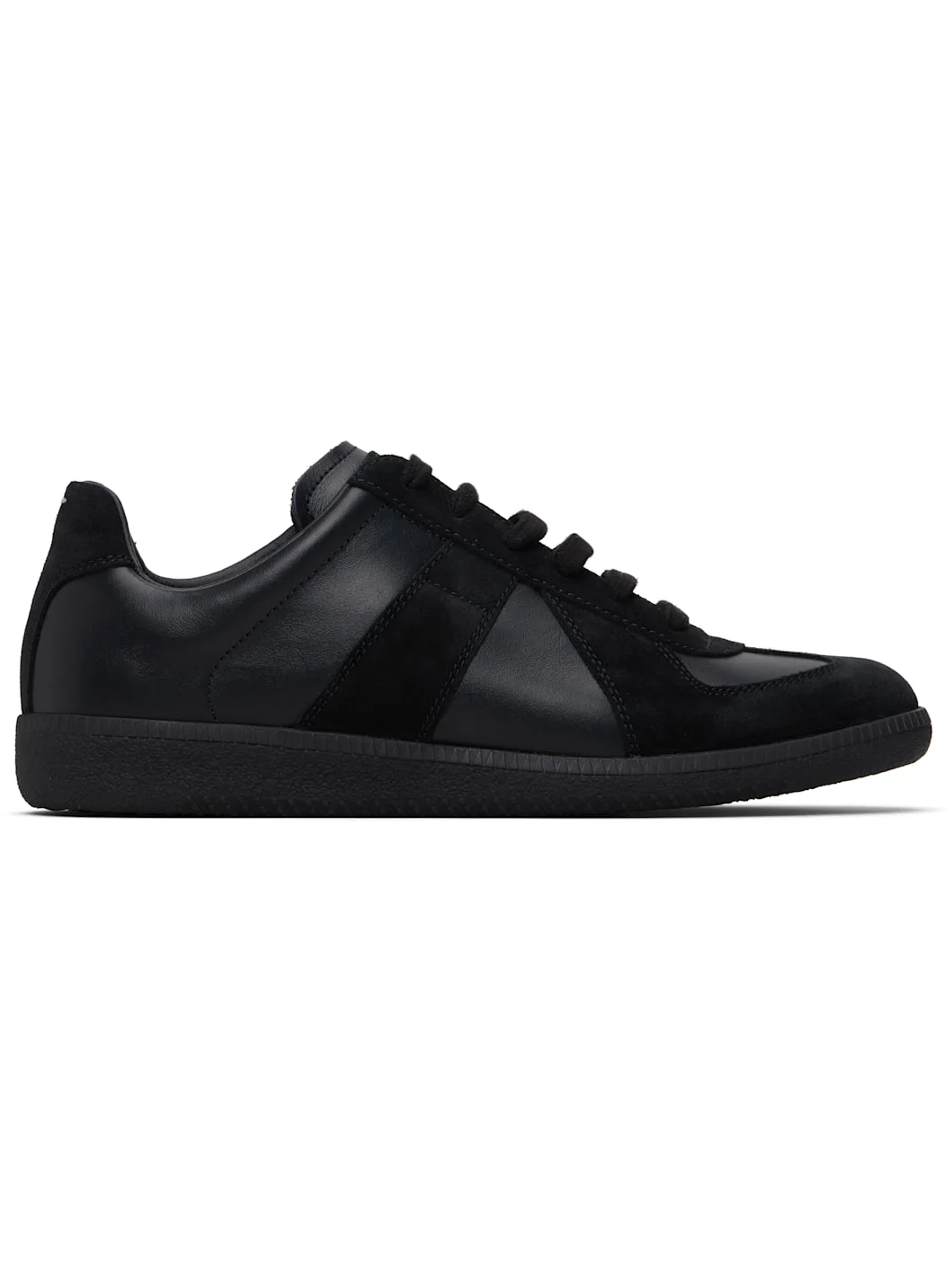 Low-top buffed nappa calfskin sneakers. · Calfskin suede trim throughout · Lace-up closure · Logo patch at padded tongue · Padded collar · Signature white stitch at heel tab · Grosgrain lining · Treaded rubber sole Supplier color: Black Upper: lamskin, calfskin. Sole: rubber. Made in Italy 261168M237011
