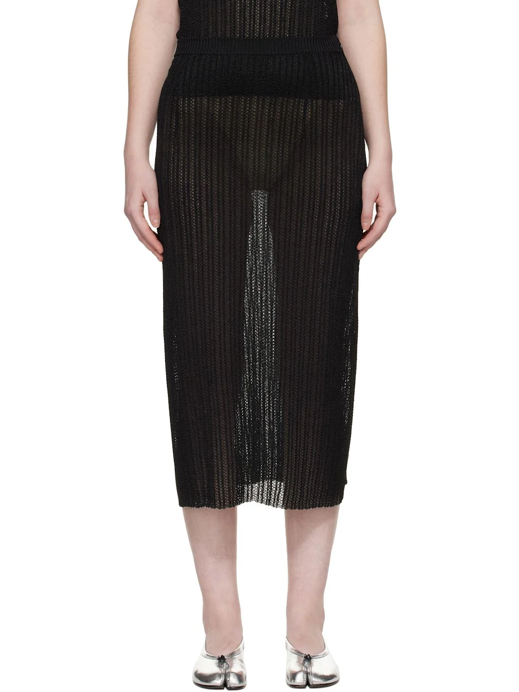 Semi-sheer knit midi skirt. · Rib-knit at waistband · Concealed zip closure at outseam · White stitches at back waist · Central vent at back hem Supplier color: Black 59% polyester, 41% viscose. Made in Italy 261168F092000