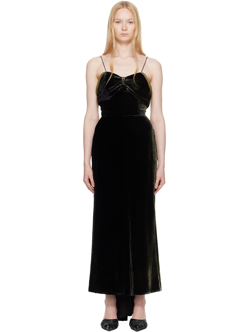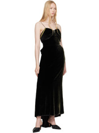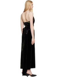 Viscose- and silk-blend velvet maxi dress. · Sweetheart neck · Boning at chest · Ruching at chest and side seams · Silk-blend canvas trim at chest · Fixed spaghetti straps · White stitching at back · Ruffles at concealed zip closure · Grosgrain hook-eye strap at interior back · Full jersey lining Supplier color: Black Body: 82% viscose, 18% silk. Lining: 50% acetate, 50% viscose. Made in Italy 251168F055000