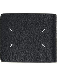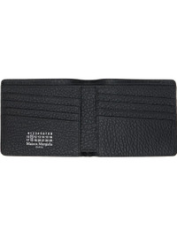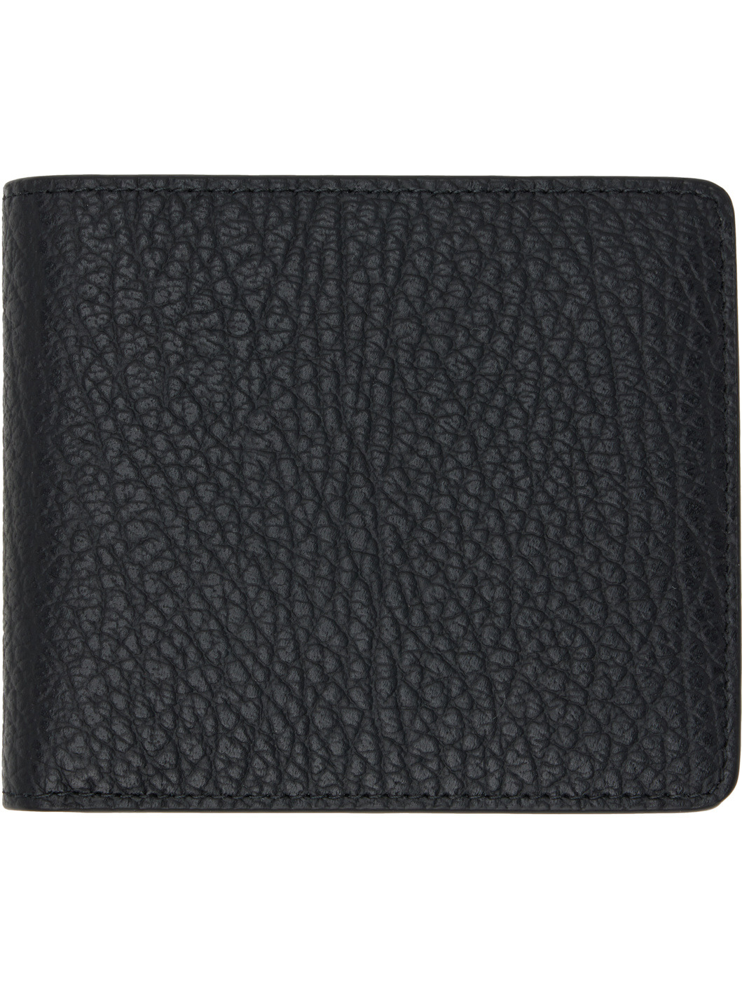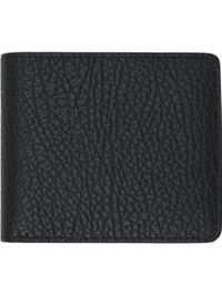 Pebble-grained calfskin bifold wallet. · White stitching at back face · Eight card slots and two patch pocket at interior · Two note slots · Canvas lining · H3.75" x W4.25" x D0.5" Supplier color: Black Calfskin. Made in Italy 252168M164010