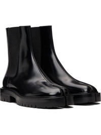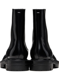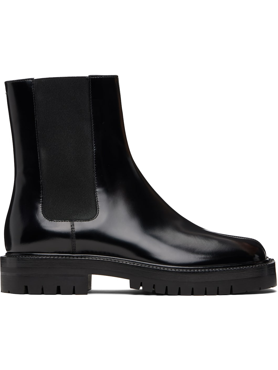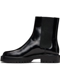 Ankle-high polished calfskin Chelsea boots. · Square cleft toe · Elasticized gusset at sides · Signature white stitch at heel collar · Buffed lambskin lining · Stacked leather heel and midsole · Lugged rubber sole · Heel: H1.25" Supplier color: Black Upper: calfskin. Sole: rubber. Made in Italy 252168F113008