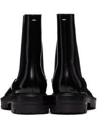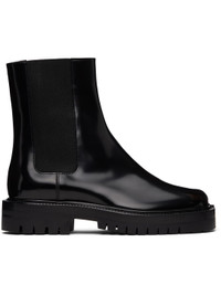 Ankle-high brushed calfskin Chelsea boots. · Square cleft toe · Elasticized gusset at sides · White stitching at heel collar · Buffed lambskin lining · Stacked calfskin and rubber midsole · Lugged rubber sole · Heel: H1.25" Supplier color: Black Upper: calfskin. Sole: rubber. Made in Italy 261168F113005