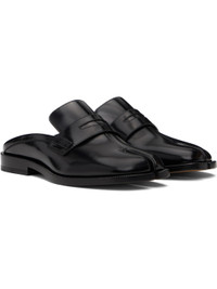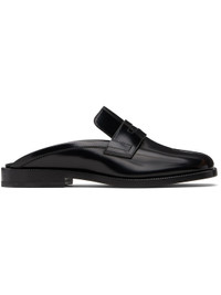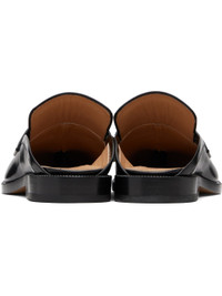 Polished calfskin slip-on loafers. · Square cleft toe · Strap with cutout at vamp · Signature white stitch at inner side · Buffed leather lining · Serrated edge at welt · Stacked leather heel with rubber injection · Polished calfskin sole Supplier color: Black Upper: calfskin. Sole: calfskin, rubber. Made in Italy 252168F121014