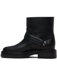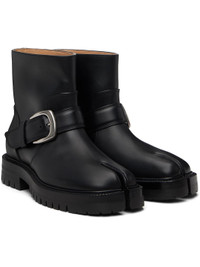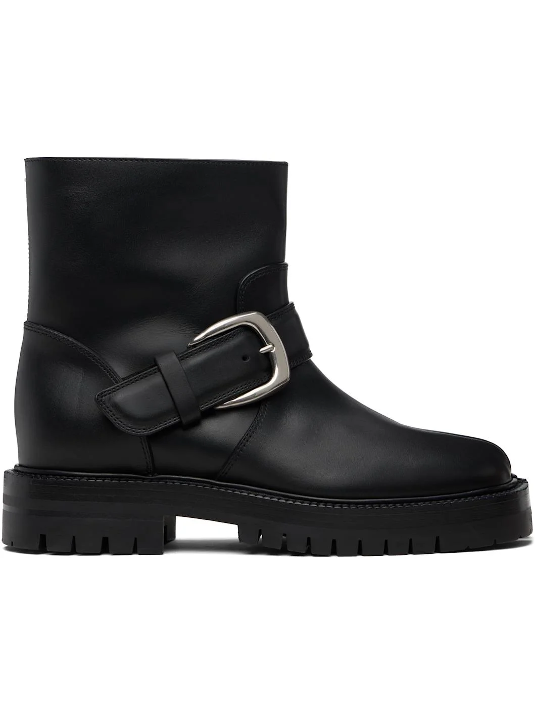 Ankle-high buffed calfskin boots. · Cleft toe · Pin-buckle strap at vamp · White stitch at collar · Buffed leather lining · Treaded rubber sole Supplier color: Black Calf leather. Made in Italy 261168M228000