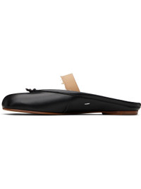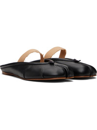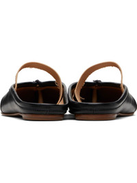 Buffed lambskin mules. · Square cleft toe · Knotted accent at vamp · Raw edge at elasticized strap · Gathering at sides · Signature white stitch at inner side · Logo printed at lambskin footbed · Smooth calfskin sole with rubber injection Supplier color: Black Upper: lambskin. Sole: calfskin, rubber. Made in Italy 252168F121005