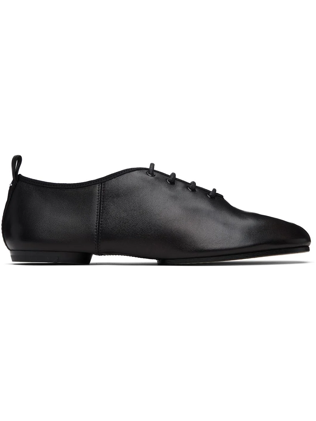 Grained sheepskin derbys. · Cleft toe · White stitching at vamp and heel collar · Lace-up closure · Pull-loop at heel collar · Faux-suede lining · Calfskin nubuck sole with rubber injection Supplier color: Black Upper: sheepskin. Sole: calfskin. Made in Italy 261168M225002