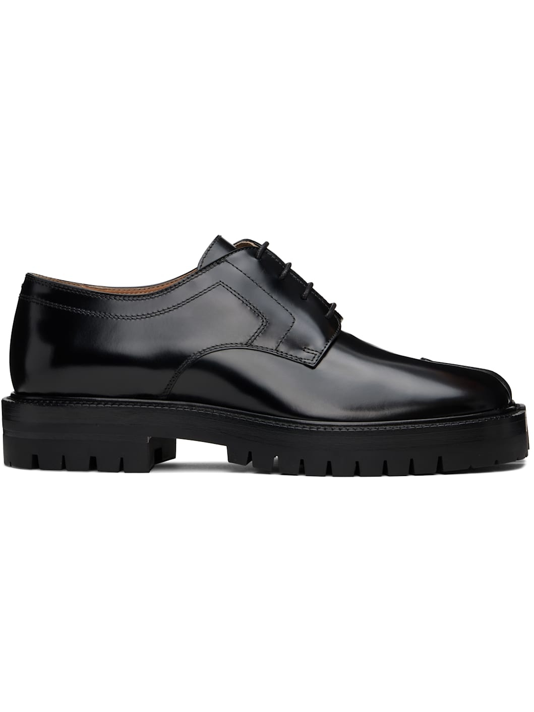 Polished calfskin derbys in black. · Square cleft toe · Lace-up closure · White stitching at heel collar · Buffed lambskin and suede lining · Serrated detailing at welt · Stacked calfskin block heel with rubber injection · Stacked calfskin midsole · Lugged rubber sole · Heel: H1.5" Supplier color: Black Upper: calfskin. Sole: calfskin, rubber. Made in Italy 242168M225006