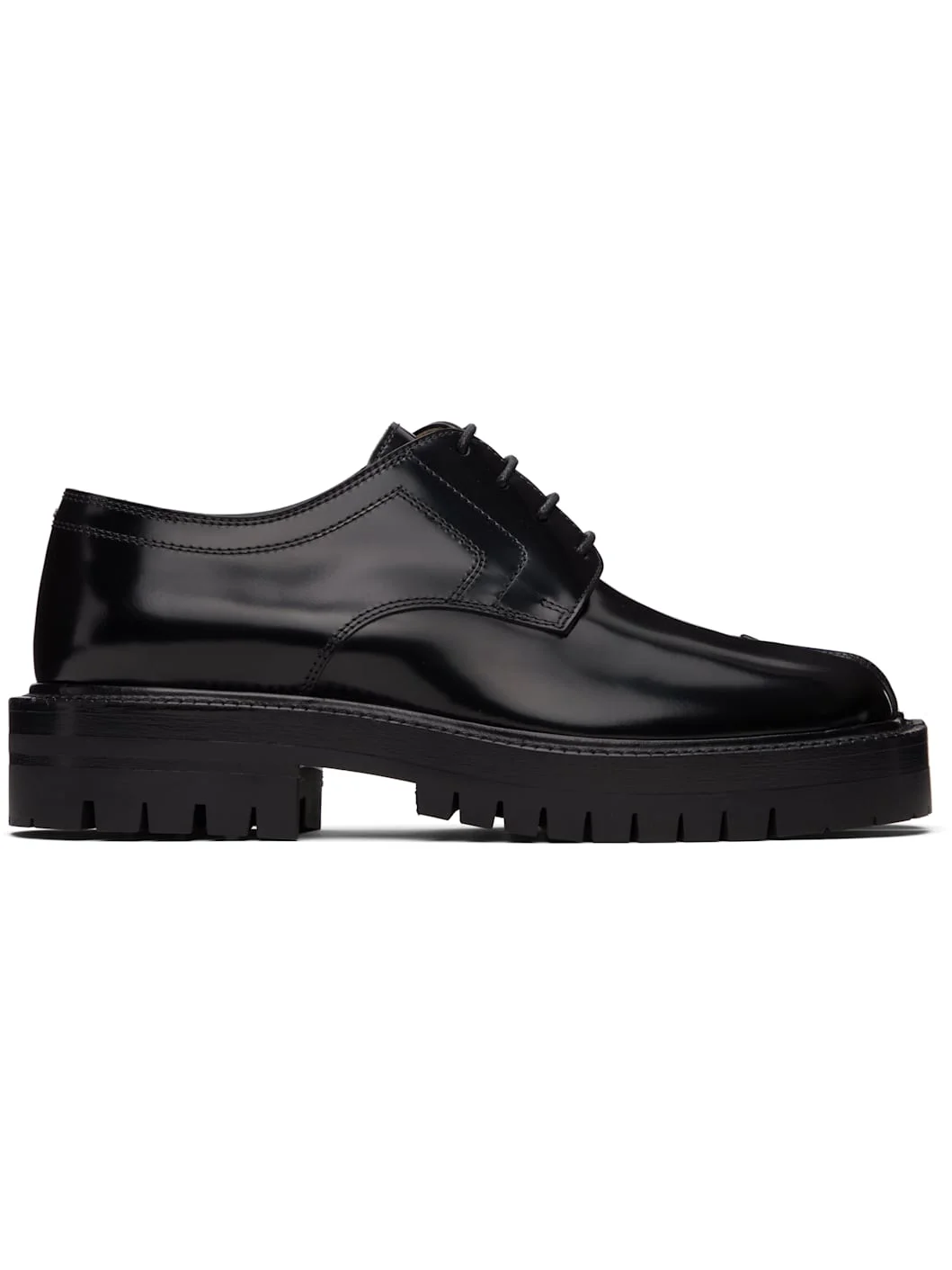 Polished calfskin derbys. · Square cleft toe · Lace-up closure · White stitching at heel collar · Buffed lambskin lining · Stacked calfskin and rubber midsole · Lugged rubber sole · Heel: H1.25" Supplier color: Black Upper: calfskin. Sole: rubber. Made in Italy 261168F120002