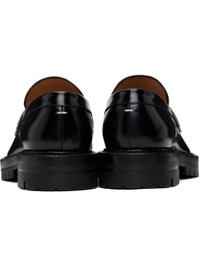 Polished calfskin loafers. · Square cleft toe · Strap with cutout at vamp · White stitching at heel collar · Buffed lambskin lining · Serrated edge at welt · Treaded rubber sole Supplier color: Black Upper: calfskin. Sole: rubber. Made in Italy 252168M231008