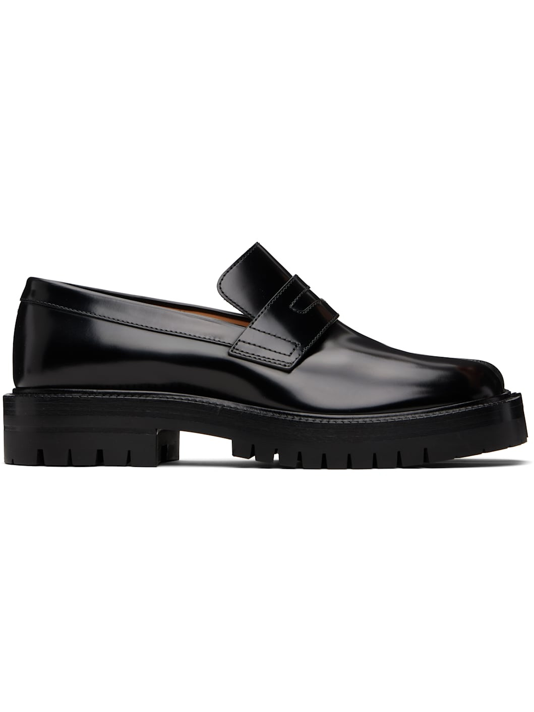 Polished calfskin loafers. · Square cleft toe · Strap with cutout at vamp · Signature white stitch at heel collar · Buffed lambskin lining · Stacked calfskin and rubber midsole · Lugged rubber sole · Heel: H1.25" Supplier color: Black Upper: calfskin. Sole: calfskin, rubber. Made in Italy 252168F121008