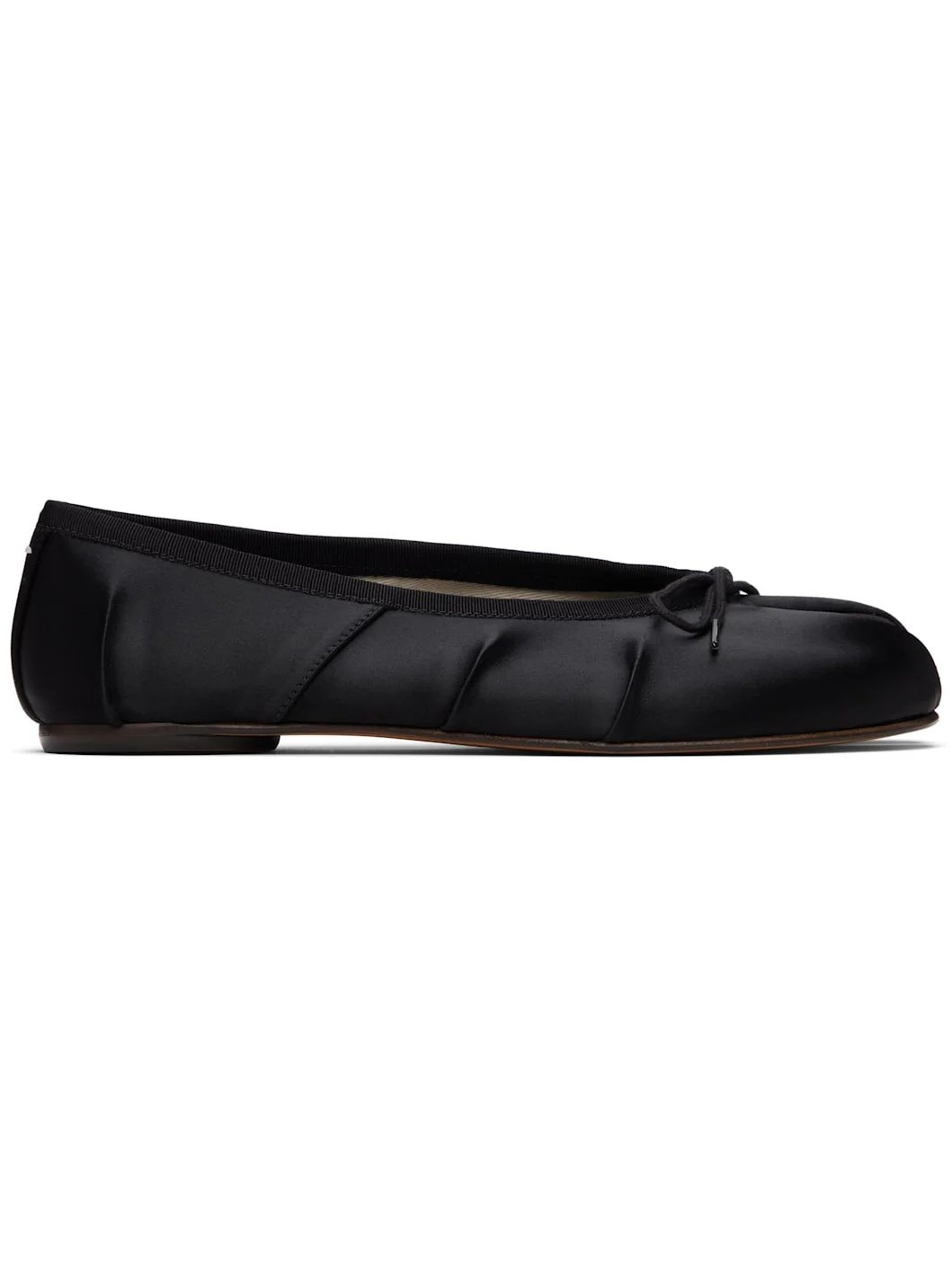 Satin ballerina flats. · Square cleft toe · Bow accent at vamp · Darts at outer side · White stitching at heel collar · Canvas lining · Calfskin sole with rubber injection Supplier color: Black Upper: textile. Sole: calfskin. Made in Italy 261168F118000