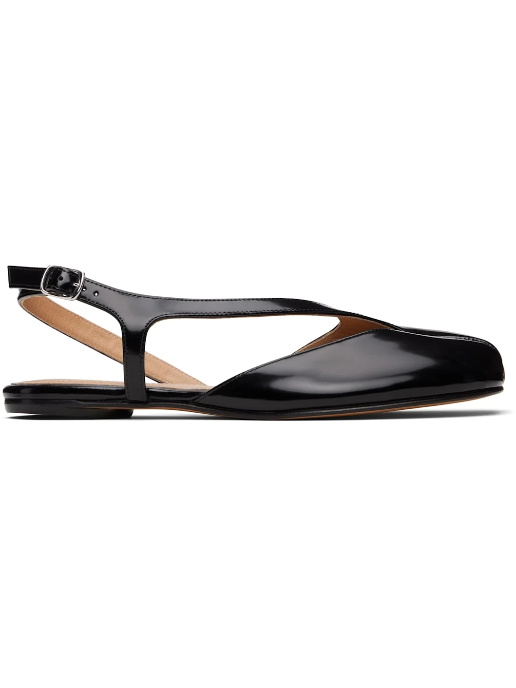 Patent calfskin ballerina flats. · Square cleft toe · Strap at vamp · White stitching at pin-buckle slingback strap · Buffed leather lining · Calfskin sole Supplier color: Black Calfskin. Made in Italy 261168F118010