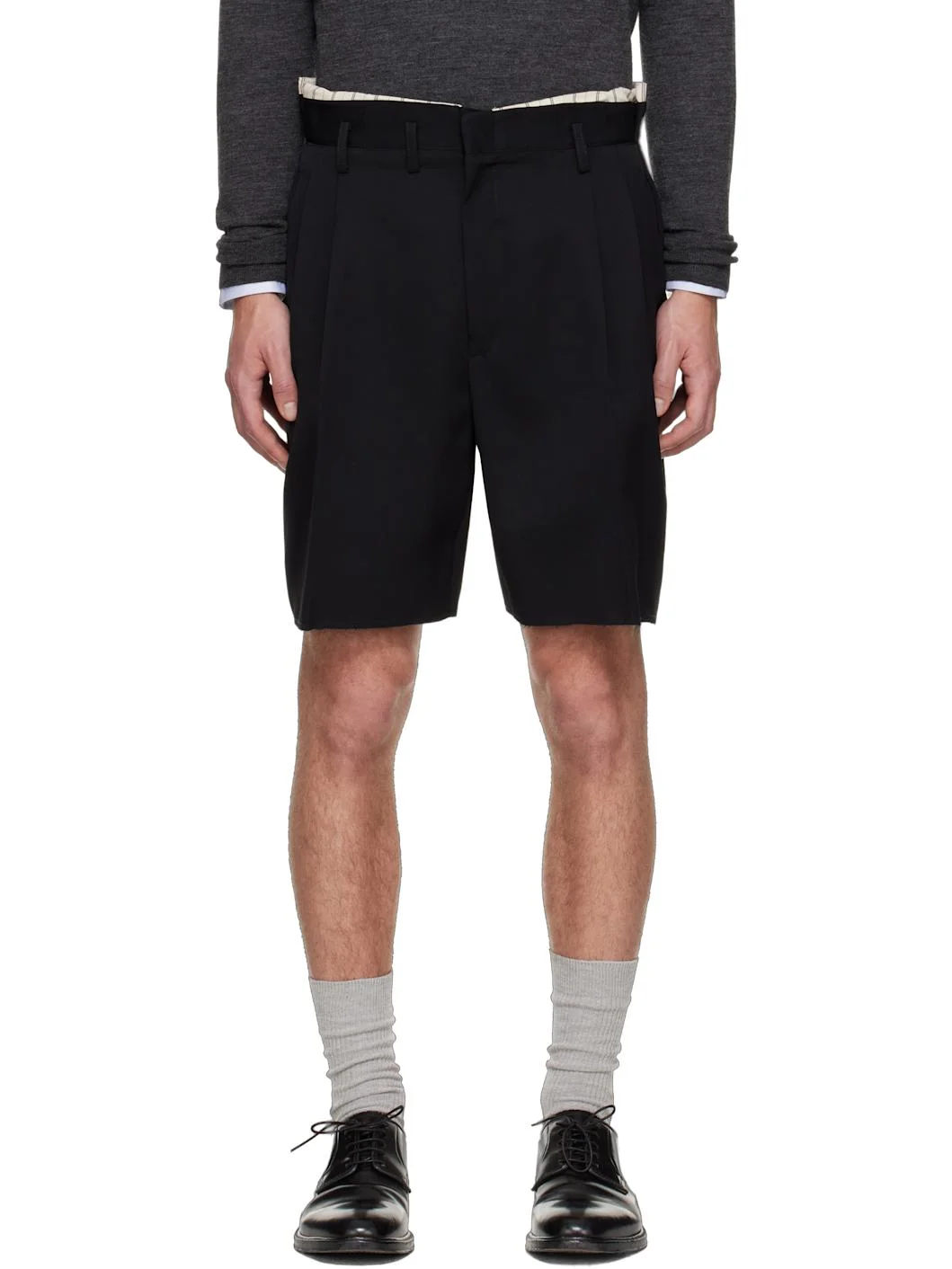 Virgin wool twill shorts. · Striped poplin trim at waistband · Belt loops · Four-pocket styling · Zip fly · Pleats at front · Creased legs · Raw edge at cuffs · White stitching at back · Partial satin lining Supplier color: Black Body: 100% virgin wool. Trim 1: 100% cotton. Trim 2: 100% viscose. Made in Italy 261168M193000