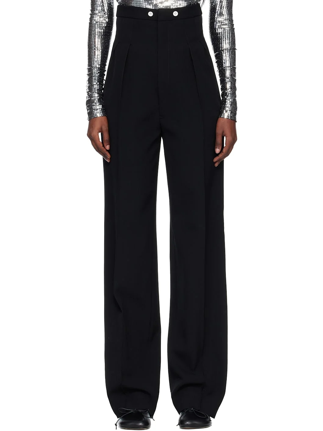 Virgin wool twill trousers. · Straight-leg · High-rise · Zip fly · Pleats at waistband · Pinched seam at legs · Satin trim at outseams · White stitching at back waistband · Partial viscose satin lining Supplier color: Black Body: 100% wool. Lining: 100% viscose. Made in Italy 261168F087000