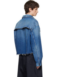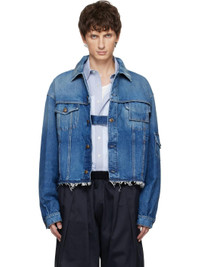 Non-stretch denim jacket. · Fading throughout · Spread collar · Button closure · Storm flap at front and back · Flap pockets at front · Frayed edge at cropped hem · Dropped shoulders · Flap pocket at sleeve · Buttoned barrel cuffs · White stitching and zip detailing at back · Zip pockets, patch pockets, and button tab at interior · Unlined · Contrast stitching in tan Supplier color: Vintage medium blue 100% cotton. Made in Italy 252168M177001