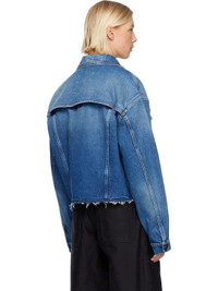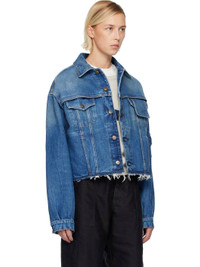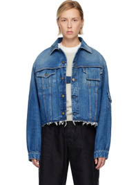 Non-stretch denim jacket. · Fading and whiskering throughout · Spread collar · Button closure · Flap pockets at chest · Seam pockets at waist · Frayed edge at hem · Flap pocket at sleeve · Buttoned barrel cuffs · White stitching at back collar · Zipper detailing at back yoke Supplier color: Vintage medium blue Body: 100% cotton. Trim: 65% polyester, 35% cotton. Made in Italy 252168F060002