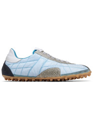 Low-top quilted taffeta and calfskin suede sneakers. · Smudging throughout · Lace-up closure · Logo patch at padded tongue · White stitch at heel tab · Buffed calfskin and jersey lining · Treaded rubber sole Supplier color: Blue/White Upper: textile, calfskin. Sole: rubber. Made in Italy 252168F128002