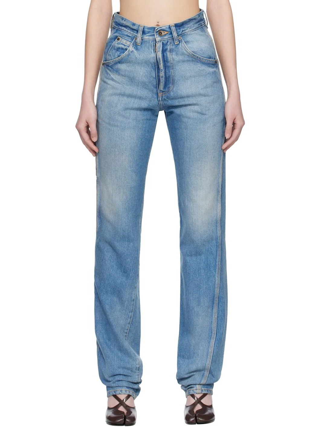 Straight-leg 14 oz non-stretch denim jeans. · Fading and whiskering throughout · Belt loops · Five-pocket styling · Zip fly · Hammer loop at outseam · Patch pockets at outseam · White stitching at back waist · Contrast stitching in tan Supplier color: Blue Jeans 100% cotton. Made in Italy 261168F069000