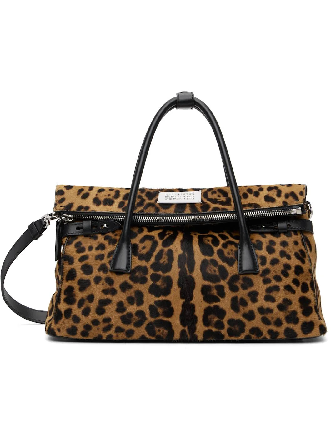 Hair-on calfskin top handle bag. · Leopard pattern printed throughout · Press-stud tab at twin rolled carry handles · Adjustable and detachable crossbody strap · Logo patch at face · White stitching and patch pocket at back face · Logo-embossed card holder at back face · Adjustable post-stud tab at sides · Bumper studs at base · Foldover zip closure · Zip pocket at interior · Microfiber lining · H8" x W13" x D5" Supplier color: Leopard/Black Calfskin. Made in Italy 252168F048007