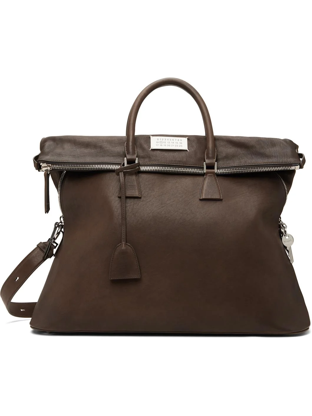 Grained calfskin duffle bag. · Rolled carry handles with detachable keyring · Adjustable and detachable crossbody strap · Logo patch at top · Stitching and leather pocket at back face · Mismatched bumper studs at base · Zip closure with key-shaped pull tab · Stowaway panel with zip closure · Card slot and zip pocket at interior · Twill lining · H15" x W20" x D8" Supplier color: Ebony Calfskin. Made in Italy 252168F048004