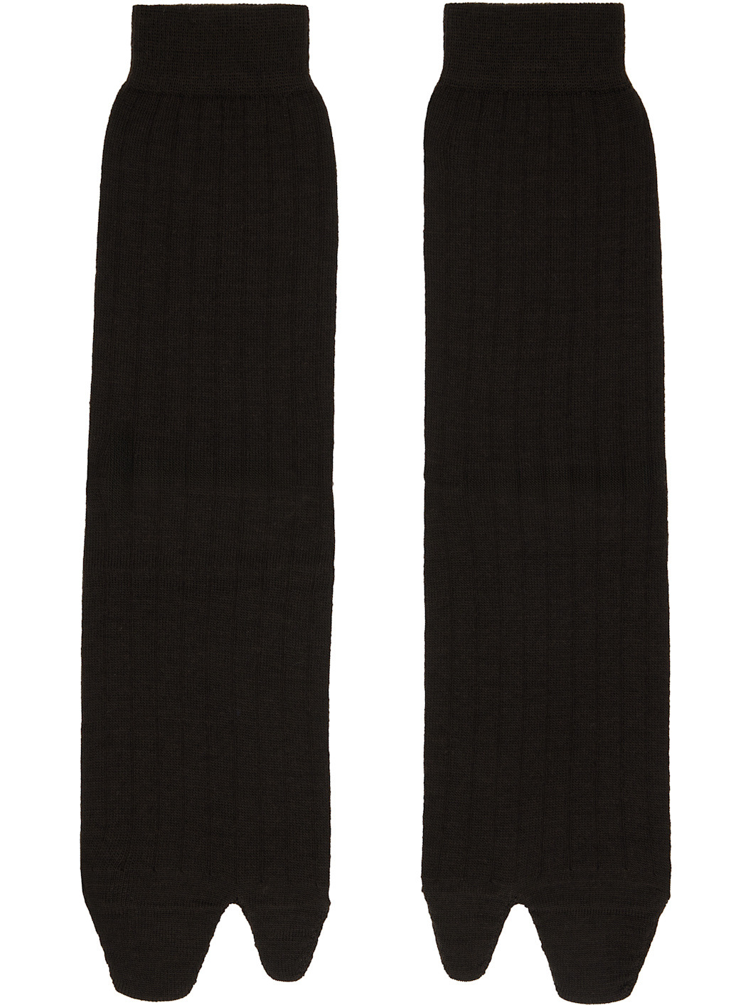Calf-high wool- and nylon-blend jersey socks. · Signature white stitching at rib knit cuff · Cleft toe Supplier color: Dark brown 78% wool, 22% polyamide. Made in Italy 252168F076001