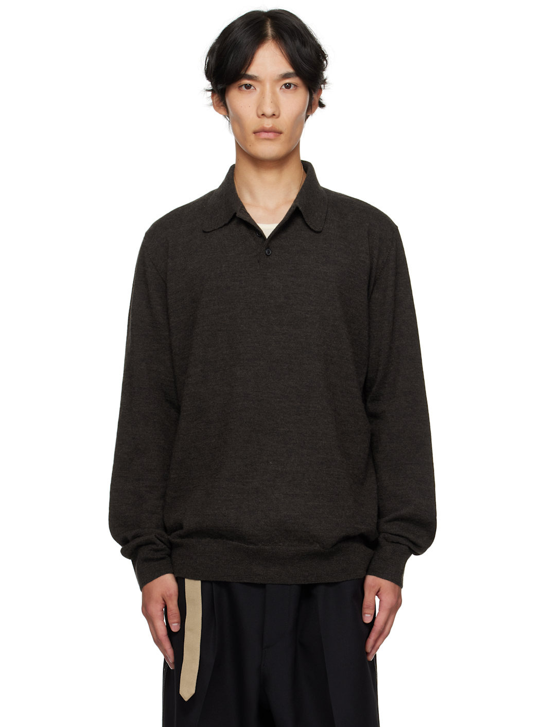 Knit wool polo. · Rib-knit spread collar, hem, and cuffs · Three-button placket · Suede elbow patches · White stitching at back collar Supplier color: Dark brown 100% wool. Made in Romania 252168M212002