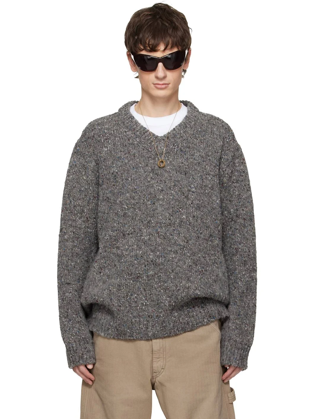 Handcrafted brushed knit virgin wool sweater. · 3-gauge · Marling throughout · Rib-knit V-neck, hem, and cuffs · Dropped shoulders · White stitching at back Supplier color: Grey 100% virgin wool. Made in Italy 252168M206007