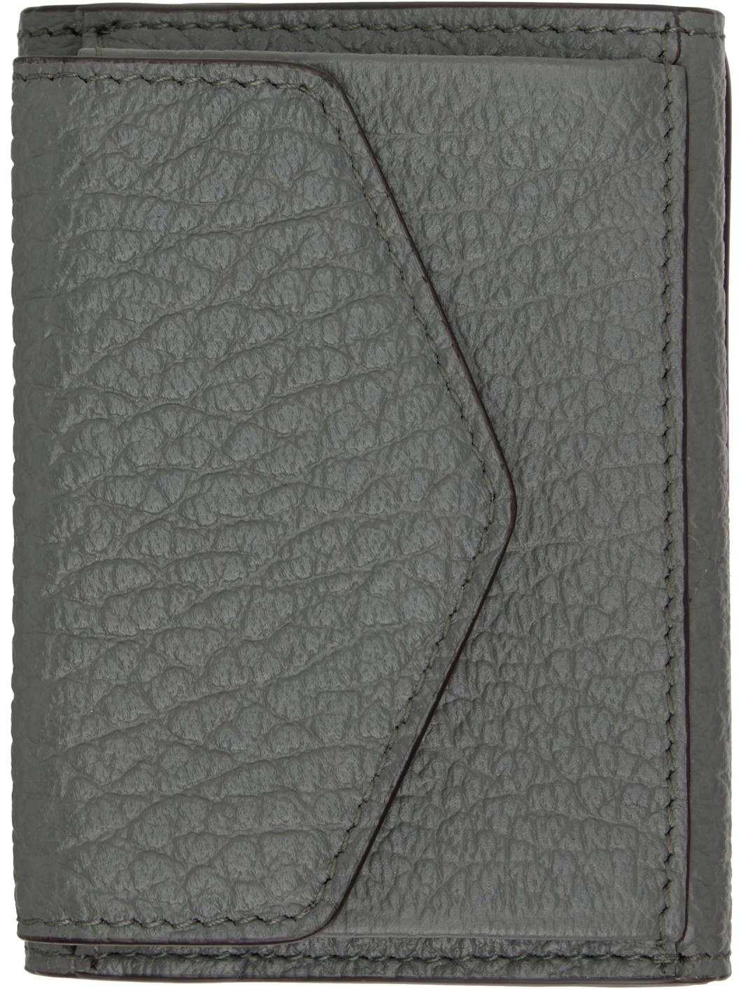 Pebble-grained calfskin trifold wallet. · Signature white stitching at face · Coin compartment at back face · Press-stud fastening · Two card slots and one note slot at interior · H4" x W2.75" x D1.25" Supplier color: Caillou Calfskin. Made in Italy 252168M164013
