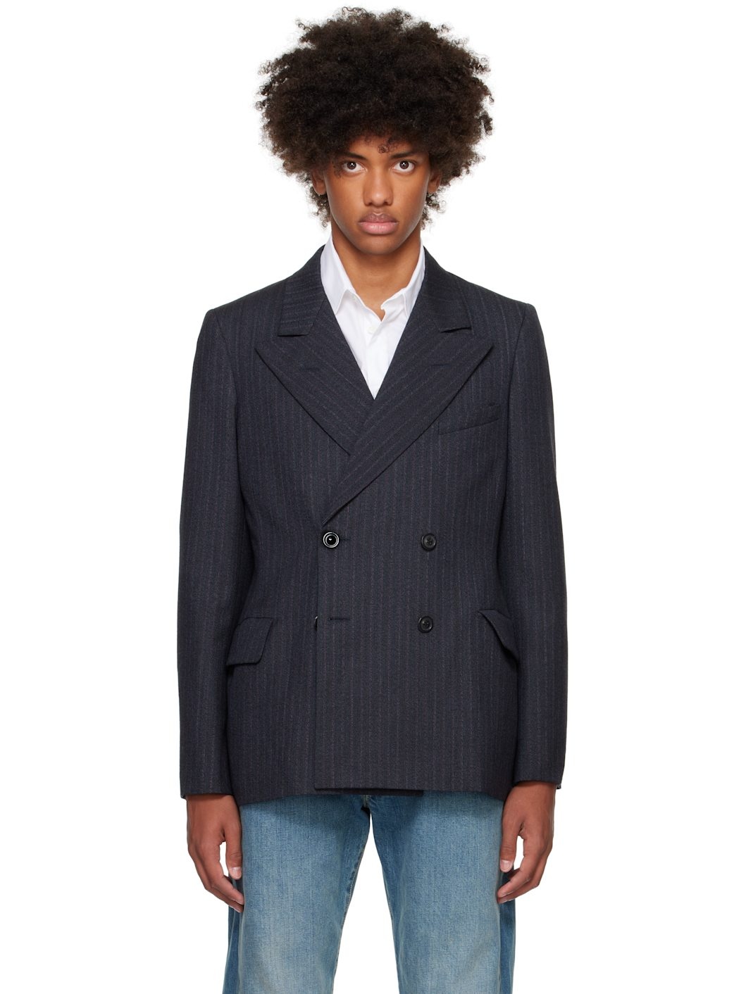 Wool barathea blazer. Pinstripes throughout. · Peaked lapel · Double-breasted button closure · Welt pocket at chest · Flap pockets · Padded shoulders · Topstitching at cuffs · White stitching at back collar · Welt pockets at interior · Full satin lining Supplier color: Gray Body: 100% wool. Lining 1: 55% viscose, 45% cotton. Lining 2: 62% cotton, 38% linen. Lining 3: 80% cotton, 20% polyester. Made in Italy 242168M195004
