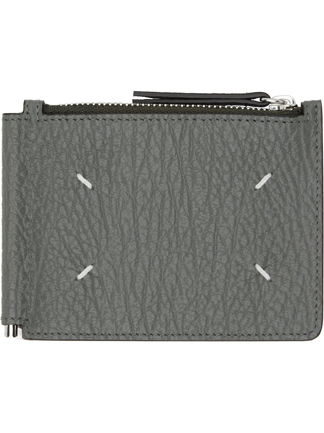 Pebble-grained calfskin bifold wallet. · White stitching at face · Three card slots at back face · Money clip at interior · Zip coin compartment · Canvas lining · H3.5" x W4.5" Supplier color: Caillou Calfskin. Made in Italy 252168M164003