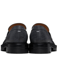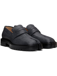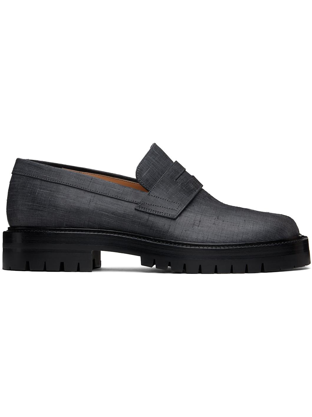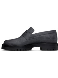 Waxed grained leather loafers in gray. · Fading throughout · Square cleft toe · Strap with cutout at vamp · Signature white stitching at heel · Logo stamp at padded sheepskin footbed · Buffed sheepskin lining · Serrated edge at welt · Lugged rubber sole · Heel: H1.5" Supplier color: Black Upper: calfskin. Sole: rubber. Made in Italy 251168M231004