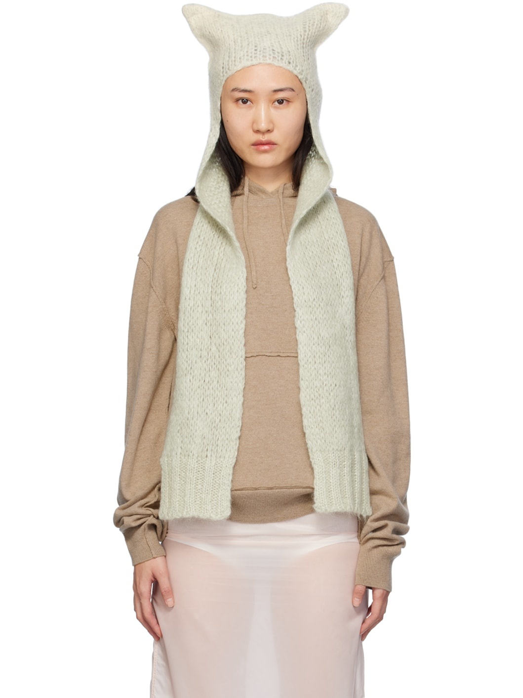 3-gauge knit mohair-blend beanie in green. Hand-treated fading throughout. · Integrated self-tie scarf · Rib knit ends · Signature white stitching at back face Supplier color: Pistachio 80% mohair, 20% polyamide. Made in Romania 241168F014000