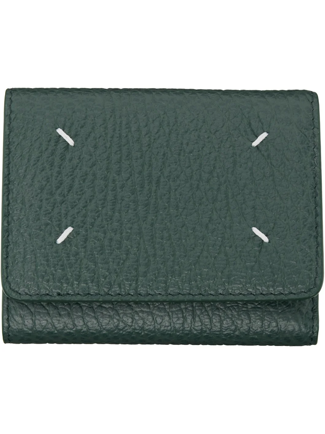 Grained calfskin trifold wallet. · White stitching at face · Patch pocket at back face · Press-stud closure · Four card slots and two patch pockets at interior · One note slot · Zip coin compartment · H4.25" x W3.5" x D1" Supplier color: Bottle green Calfskin. Made in Italy 261168M164002