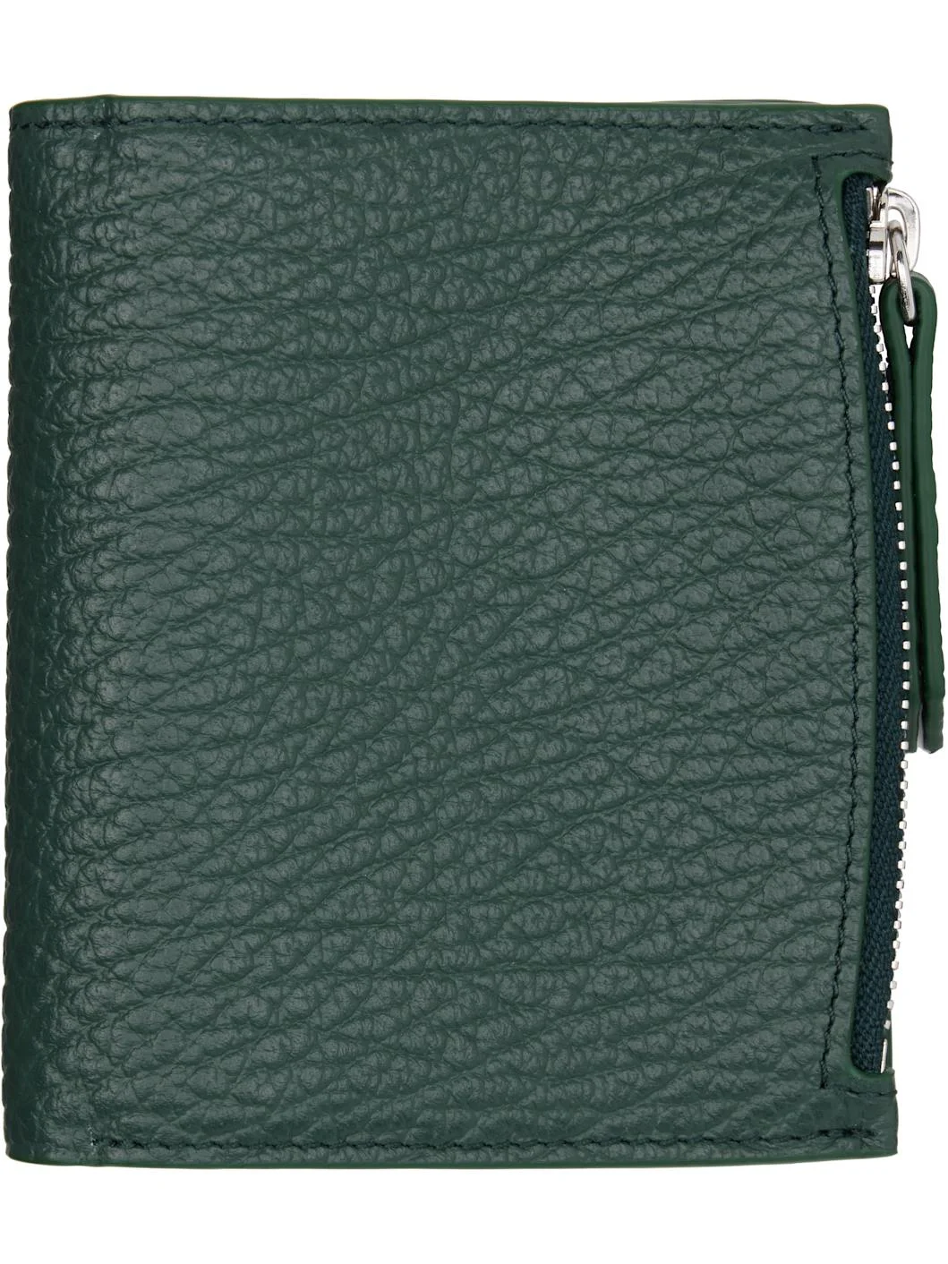 Grained calfskin bifold wallet. · White stitching at face · Six card slots and two patch pockets at interior · One note slot · Zip coin compartment · H4.25" x W3.5" x D1" Supplier color: Bottle green Calfskin. Made in Italy 261168M164005