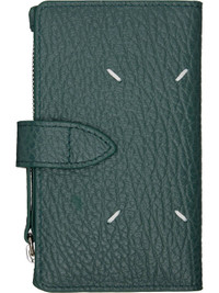 Grained calfskin card holder. · Signature white stitches at back face · Press-stud closure · Four card slots · Two patch pockets · Zip coin compartment · Grained calfskin interior · Moire lining · H5" x W3" x D0.5" Supplier color: Green Body: 100% calfskin. Lining: 100% viscose. Made in Italy 261168M163007
