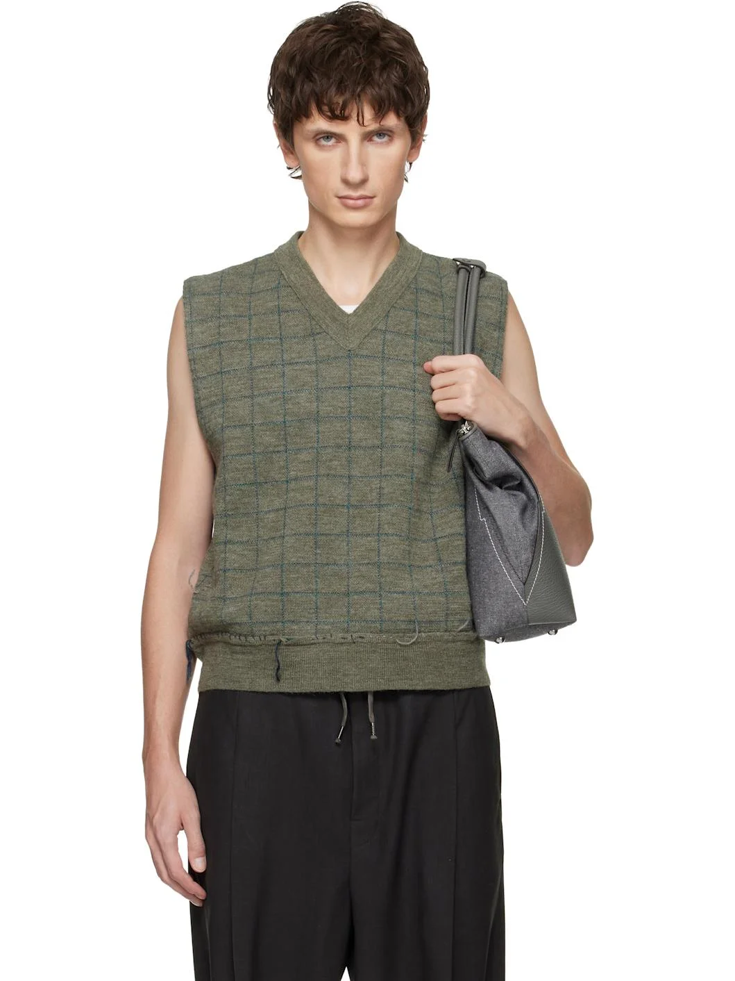 Knit virgin wool vest. · Jacquard check pattern throughout · Rib-knit V-neck and hem · Whipstitching and raw edge at hem · Loose thread detailing at hem and side · White stitching at back collar Supplier color: Military green 100% virgin wool. Made in Italy 252168M206005