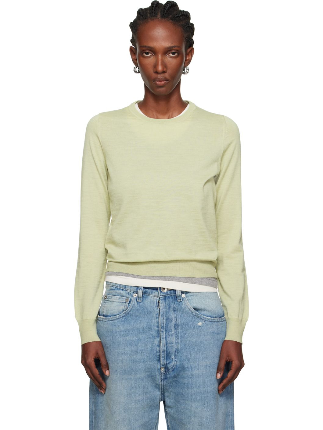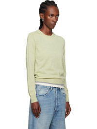 Knit wool sweater. · Rib-knit crewneck, hem, and cuffs · White stitching at back collar Supplier color: Pale green 100% wool. Made in Romania 252168F096004