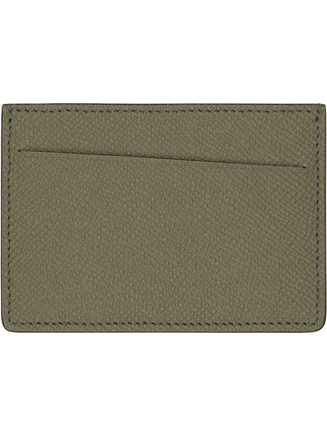 Saffiano and buffed calfskin card holder. · White stitching at back face · Two card slots · Central note slot · Canvas lining · H3" x W4" Supplier color: Khaki Calfskin. Made in Italy 252168M163010