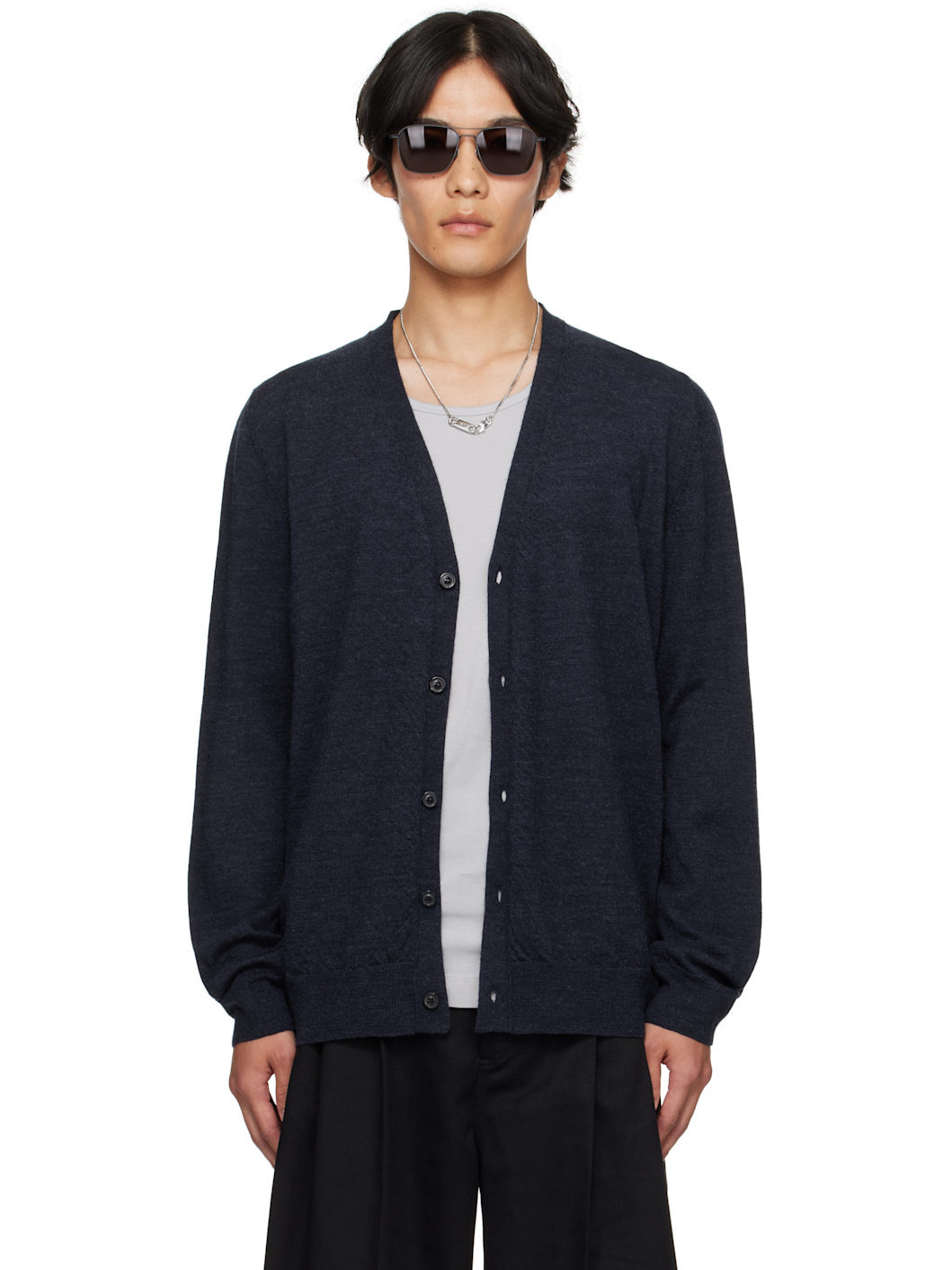 Knit wool cardigan. · Rib-knit Y-neck, hem, and cuffs · Button closure · Suede elbow patches · White stitching at back collar Supplier color: Navy 100% wool. Made in Romania 252168M200006