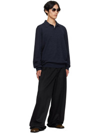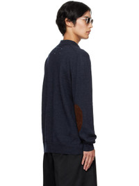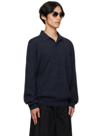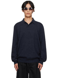 Knit wool polo. · Rib-knit spread collar, hem, and cuffs · Three-button placket · Suede elbow patches · White stitching at back collar Supplier color: Navy 100% wool. Made in Romania 252168M212001