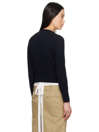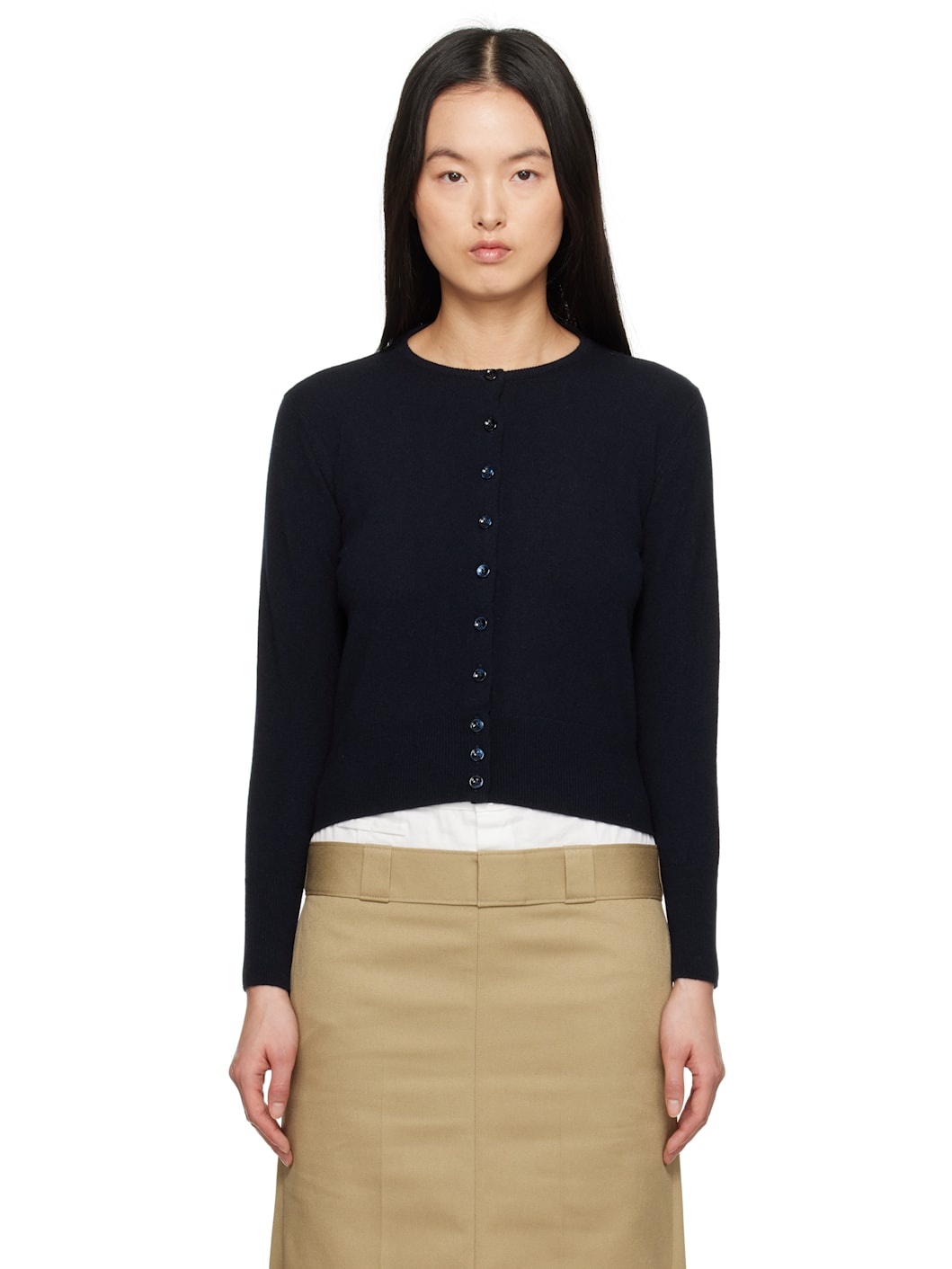 12-gauge knit virgin wool cardigan. · Rib-knit crewneck, cropped hem, and cuffs · Button closure · White stitching at back collar · Mother-of-pearl hardware Supplier color: Navy