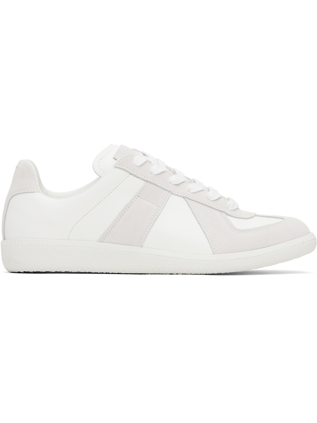 Low-top paneled grained nappa calfskin and calfskin suede sneakers in off-white. · Lace-up closure · Concealed elasticized gussets at vamp · Logo patch at padded tongue · Padded collar · Signature white stitching at heel tab · Buffed calfskin and broadcloth lining · Textured rubber midsole · Treaded rubber sole Supplier color: Off white Upper: calfskin. Sole: rubber. Made in Italy 251168M237008