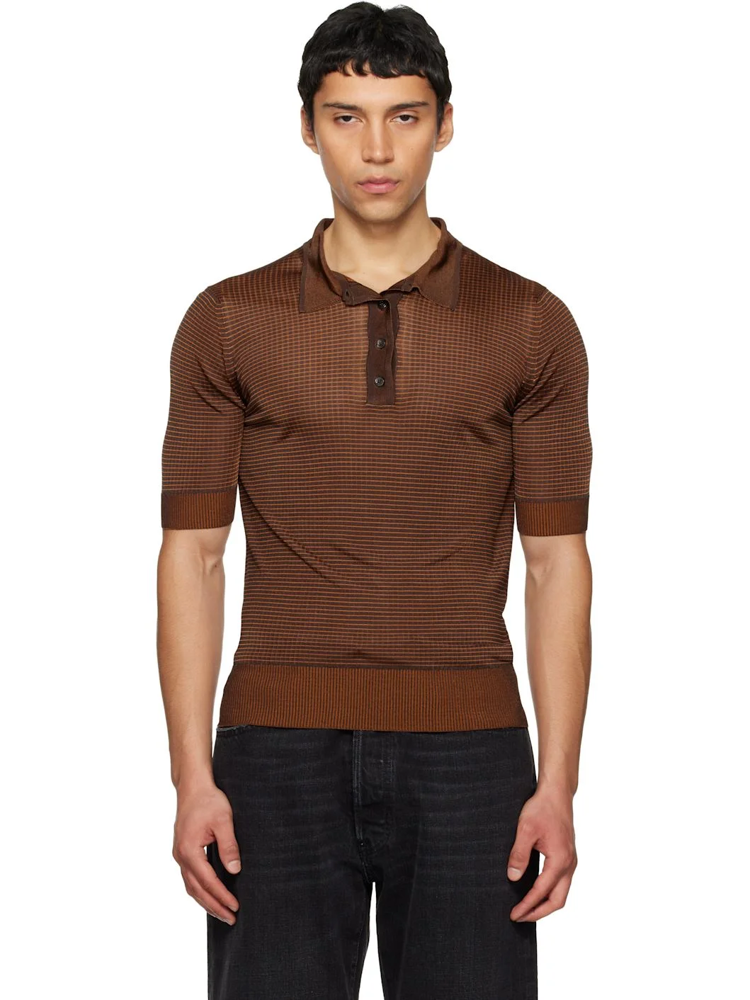 Knit polo. · Striped pattern throughout · Rib-knit spread collar, hem, and cuffs · Four-button placket · White stitches at back collar Supplier color: Tapenade 100% viscose. Made in Italy 261168M212003