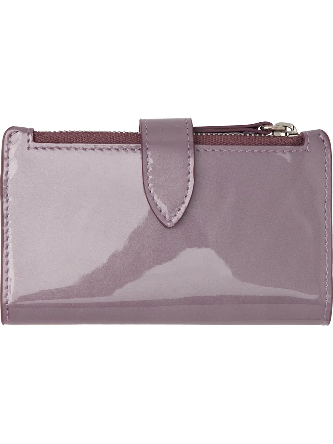 Patent calfskin card holder. · White stitching at back face · Press-stud closure · Four card slots · Two note slots · Coin compartment · Moire lining · H3" x W5.25" x D0.75" Supplier color: Dusty Pink 100% calf leather. Made in Italy 261168M163005