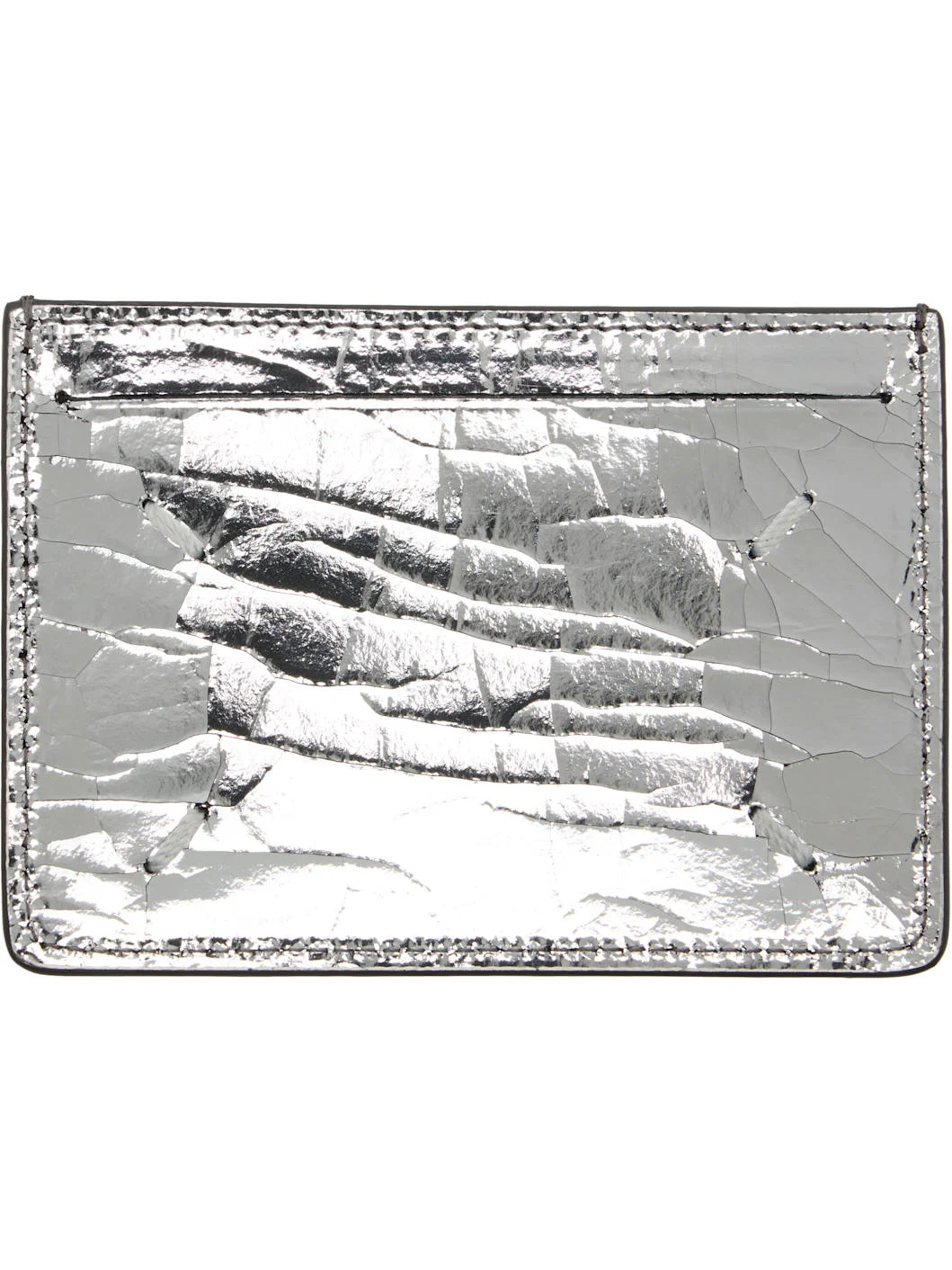 Cracked patent calfskin card holder. · White stitching at back face · Two card slots · Central note slot · H3" x W4" Supplier color: Silver Calfskin. Made in Italy 252168F037005