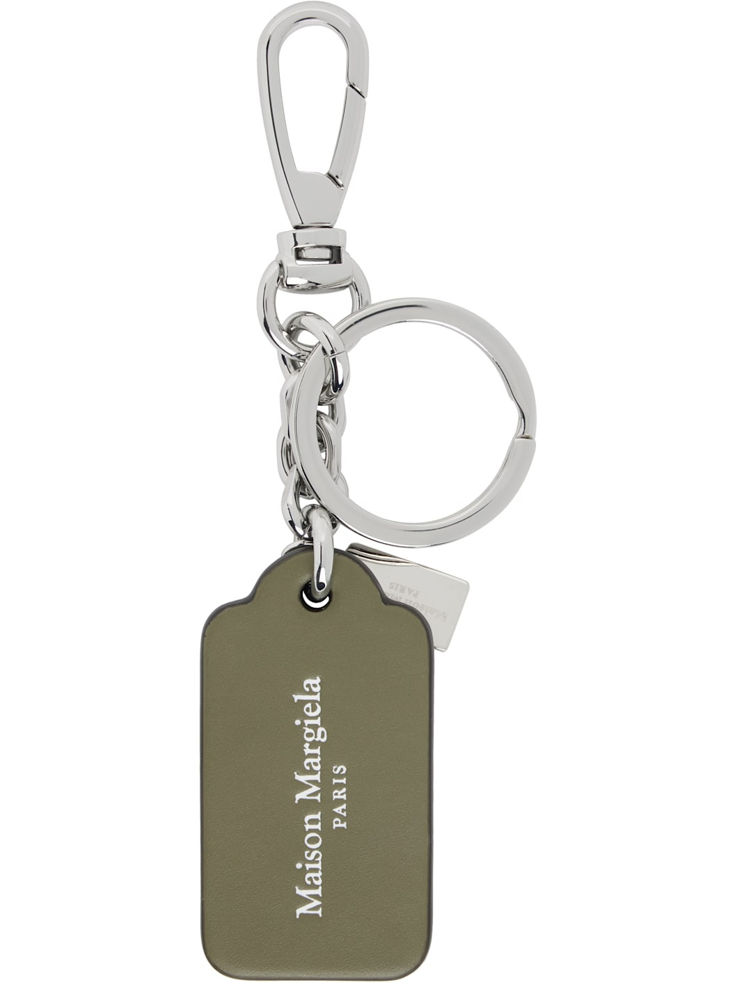 Keychain in silver-tone brass. · Key ring and clasp at top · Logo-stamped calfskin tag in khaki at drop · H5" x W1.5" Supplier color: Khaki Brass, calfskin. Made in Italy 252168M148001