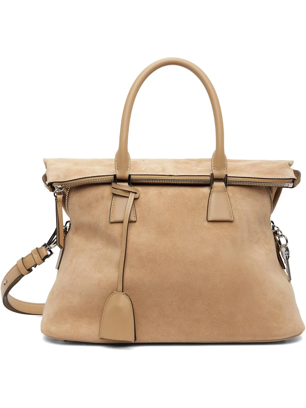 Calfskin suede messenger bag. · Rolled carry handles with detachable keyring · Adjustable and detachable crossbody strap · White stitching at back face · Mismatched bumper studs at base · Zip closure with key-shaped pull tab · Stowaway panel with zip closure · Patch and zip pockets at interior · Twill lining · H13" x W13" x D7" Supplier color: Camel Calfskin. Made in Italy 261168M170007