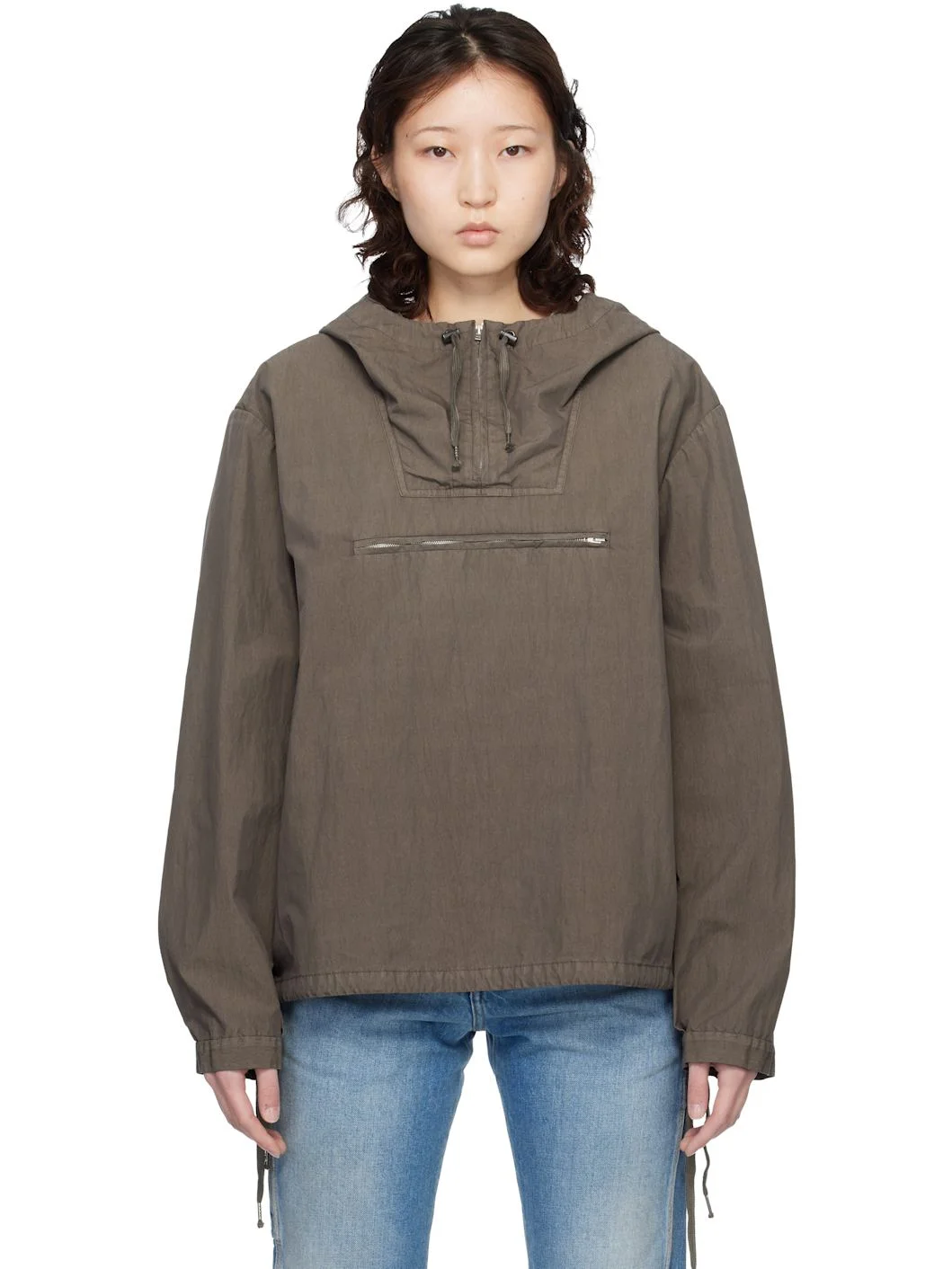 Woven cotton- and nylon-blend anorak. · Cord-lock drawstring at hood and hem · Layered half-zip closures · Zip pocket at chest · Seam pockets at waist · Button tab at cuffs · White stitching at back yoke · Unlined Supplier color: Brown 68% cotton, 32% nylon. Made in Italy 261168F063000