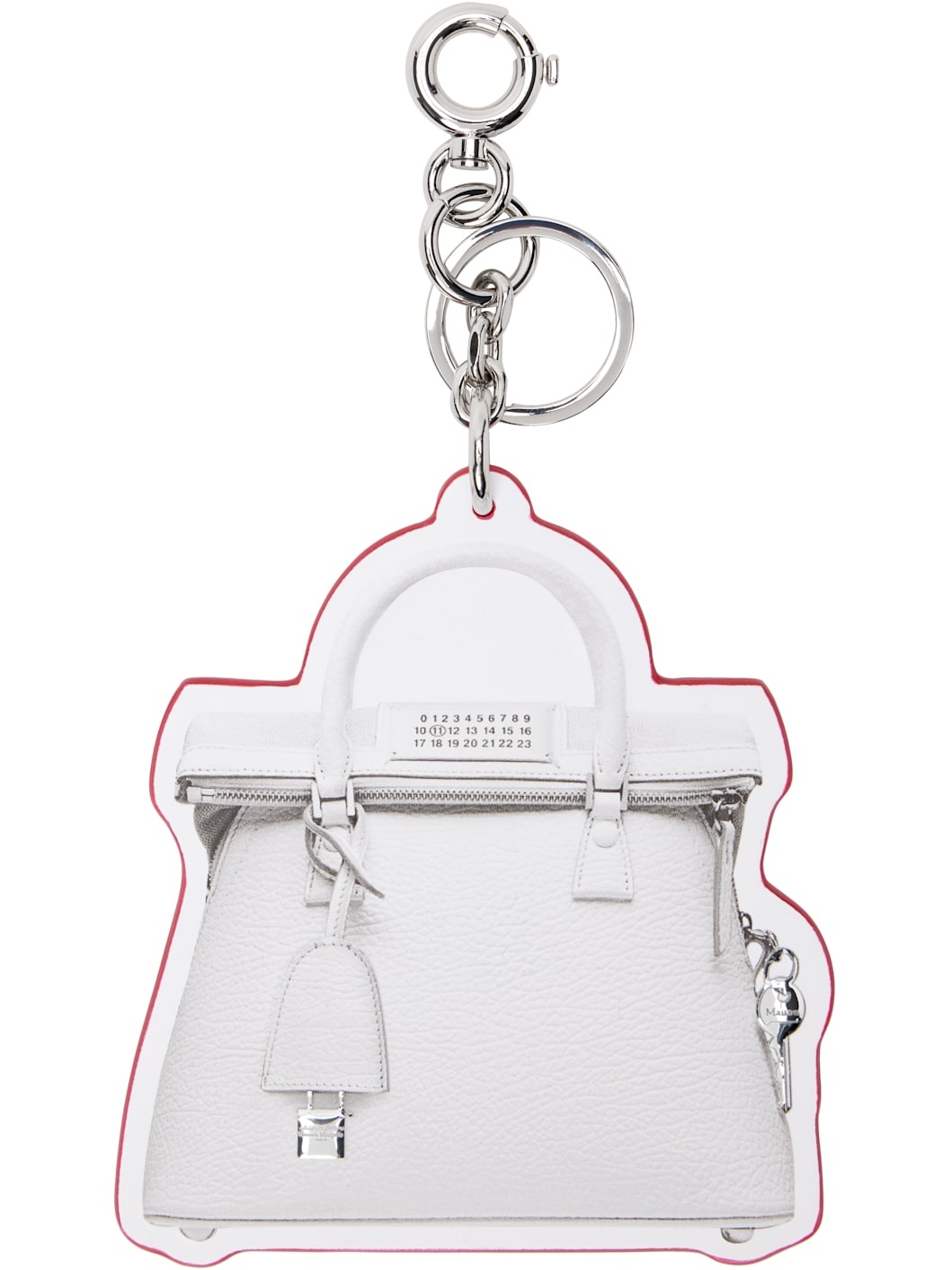 Buffed calfskin keychain in white. · Burnished edges in red · Logo graphic printed at face · Text and logo printed at back face · Keyring and spring-ring fastening · Silver-tone hardware · H7.5" x W4" Supplier color: Grey/Haute red Calfskin. Made in Italy 242168F025002