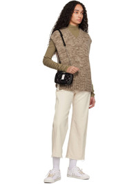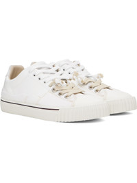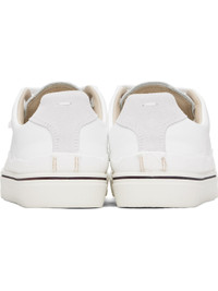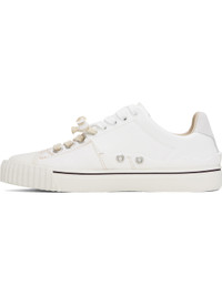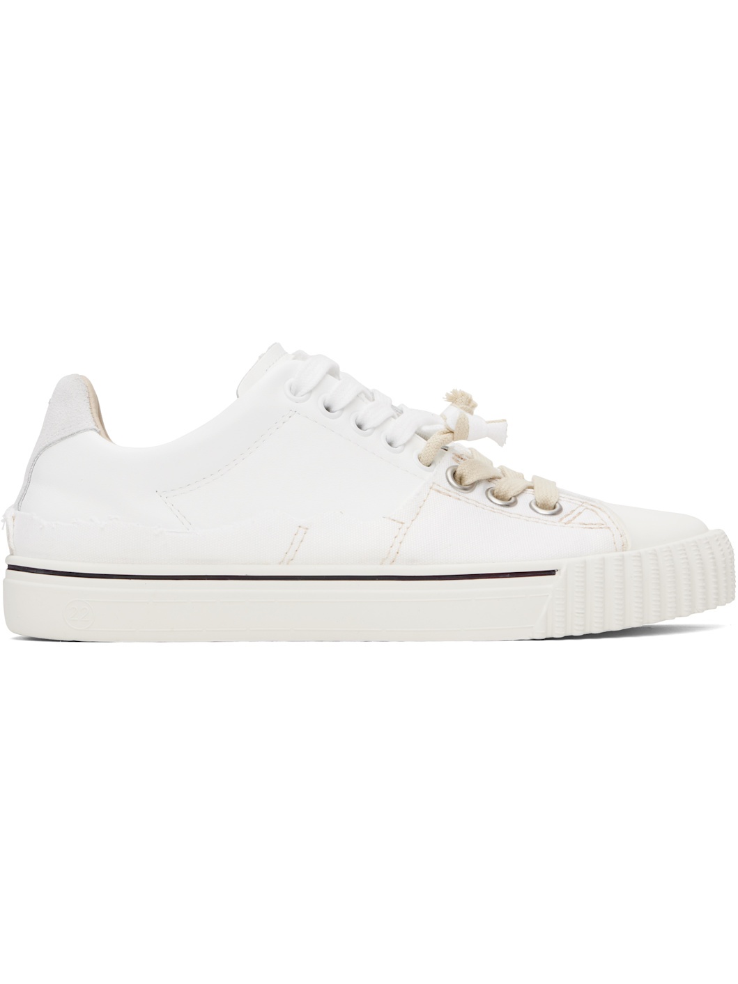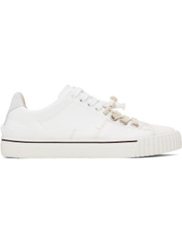 Low-top paneled canvas and buffed calfskin sneakers in white. · Raw edges throughout · Rubber cap toe · Lace-up closure · Logo patch at padded tongue · Padded collar · Metal eyelets at inner side · Signature white stitch at suede heel tab · Buffed calfskin and twill lining · Treaded rubber sole Supplier color: White/Off-White Upper: calfskin, cotton. Sole: rubber. Made in Italy 251168F128004